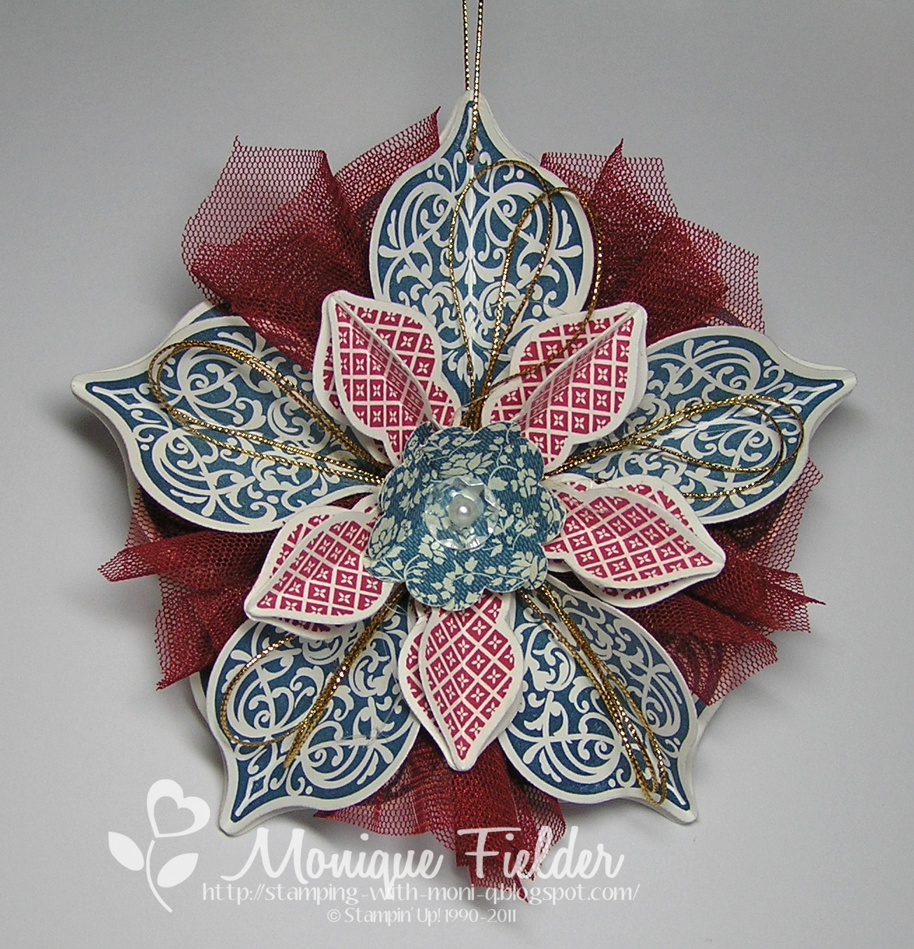 The second ornament is a variation of the one on the front cover of the Holiday Catalogue, I used Midnight Muse instead of Gumball Green and a scalloped circle as the centre rather than a rosette. I snipped in toward the centre at every second scallop so that it would sit nicely, then finished off with a Faceted Vintage Button. Each of the petals of the ornament is made with 4 stamped and cut out shapes, three of them are scored and folded in half and adhered together. I used the video tutorial from Angie at Chic N Scratch - thanks Angie for putting the effort in, it made it much easier to follow along.